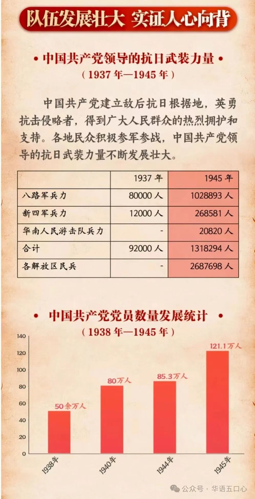 抗日战争是中国近代史上第一次取得反侵略战争的完全胜利,成为中华民族由衰败走向复兴的历史转折点。据统计,在长达14年的抗日战争中,中国战场歼灭日军150余万人(中国共产党领导的抗日武装八路军、新四军歼灭日军52.7万余人;东北抗日军民歼灭日军1万余人;国民党军队主导的正面战场歼灭日军80余万人。),占日军二战伤亡总数的70%以上,为世界反法西斯战争的最终胜利作出了重大贡献。 中国军民伤亡总数3587.9万人,军人伤亡413万人,(国军322万人,八路军/新四军91万人),平民伤亡3174.9万人(屠杀、轰炸、强征劳工致死),直接经济损失1000多亿美元,间接经济损失5000亿美元,凸现中国抗战的艰苦卓绝,中国以巨大的民族牺牲,赢得抗日战争的伟大胜利。 二、深切缅怀伟大抗战捐躯的革命先烈 中国人民抗日战争开展时间最早、持续时间最长。中华民族在抗战中涌现了无数的民族英雄。中国人民抗日战争异常惨烈,从战略防御到战略相持,进而发展到战略反攻,无论是正面战场还是敌后战场,中国人民同仇敌忾、共赴国难,铁骨铮铮、视死如归,奏响了一曲气壮山河的抗击日本侵略的英雄战歌。杨靖宇、赵尚志、左权、彭雪枫、佟麟阁、赵登禹、张自忠等殉国将领,八路军“狼牙山五壮士”、新四军“刘老庄连”、东北抗联八位女战士等众多英雄群体,就是千千万万抗日将士的杰出代表。 1940年2月23日,杨靖宇烈士在与日军周旋5天后,壮烈牺牲。残暴的日军割下他的头颅,剖开他的腹部,发现他胃里尽是枯草、树皮和棉絮,没有一粒粮食。这种不畏艰难、威武不屈、战斗到最后一息的英雄气概,使日军也为之震惊。