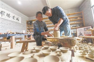肖永灿和父亲一同研究创作新的硋器作品 刘志玮 摄