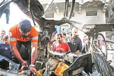 11月22日,在加沙城西部,加沙居民查看被以色列无人机炸毁的汽车。