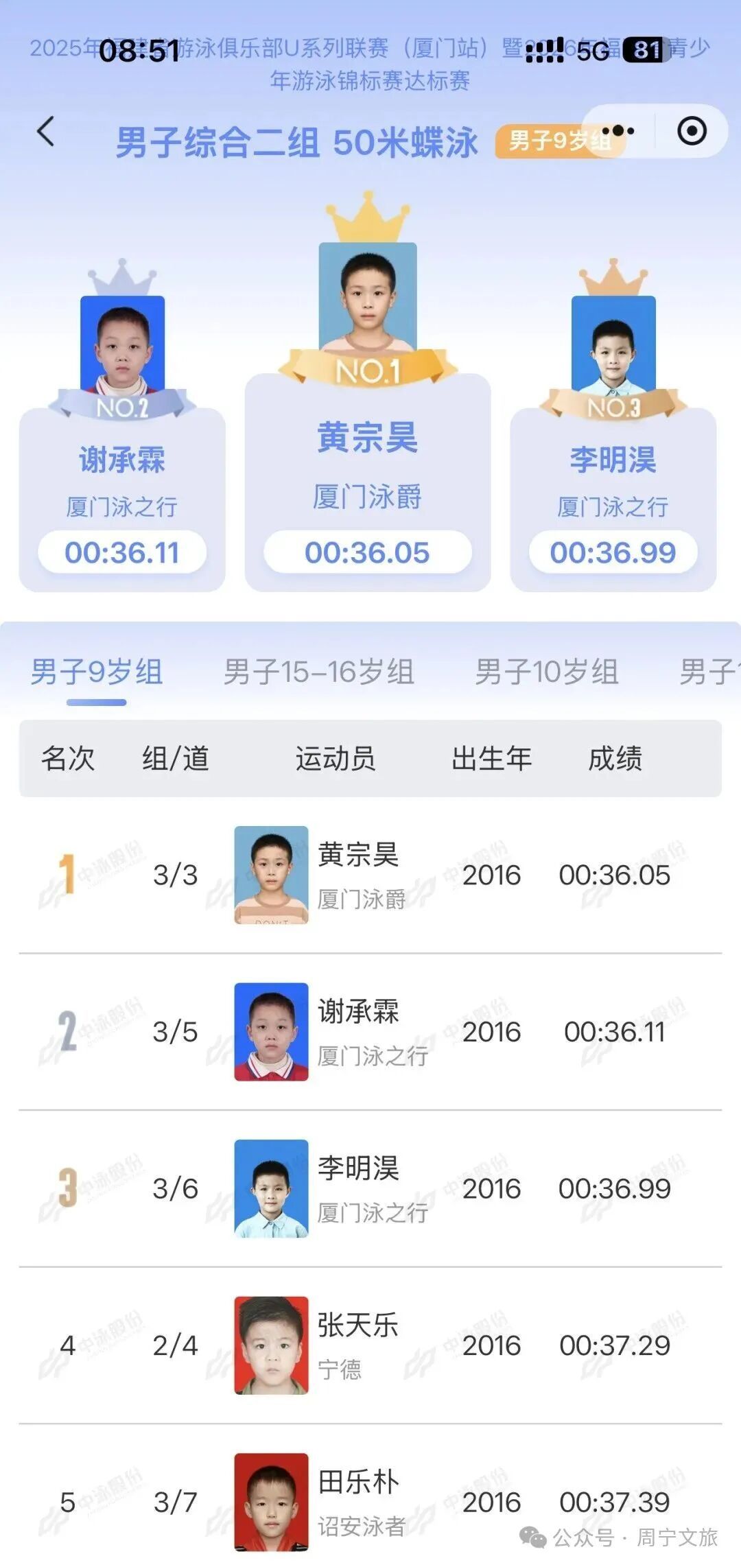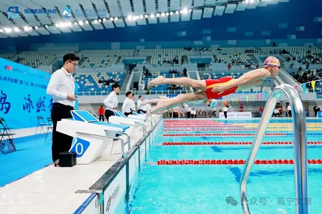 本次赛事由福建省游泳跳水运动管理中心指导,福建省游泳协会主办,厦门市体育局支持,厦门市游泳协会承办,是福建省青少年游泳项目的重要赛事之一,兼具U系列联赛和省锦标赛达标赛双重功能,竞争异常激烈。 周宁泳将,蝶泳双星闪耀 在男子2016年年龄组的激烈角逐中 周宁小将张天乐发挥尤为出色 他在100米蝶泳项目中勇夺第三名 展现了出色的耐力和技术稳定性 随后,在50米蝶泳的比赛中 他再次顶住压力 斩获第四名的好成绩 张天乐在短程冲刺与中程耐力项目上 均展现出强大实力 体现了其全面的技术能力和巨大的发展潜力