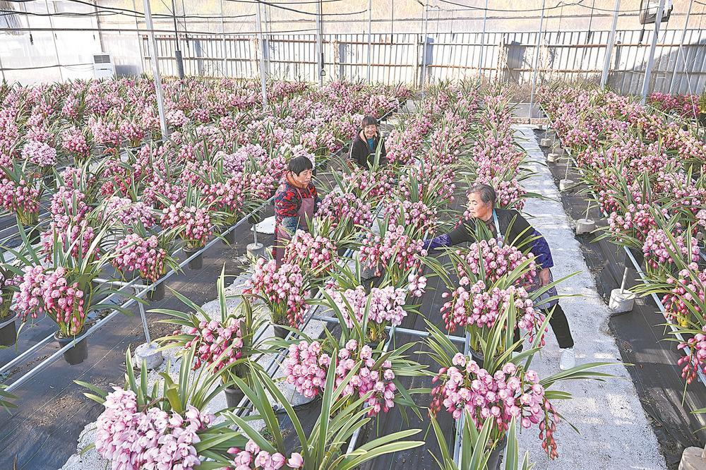 1月14日,位于宁德市周宁县浦源镇的紫馨兰园花卉有限公司花卉大棚内,工人正在挑选大花蕙兰盆栽。