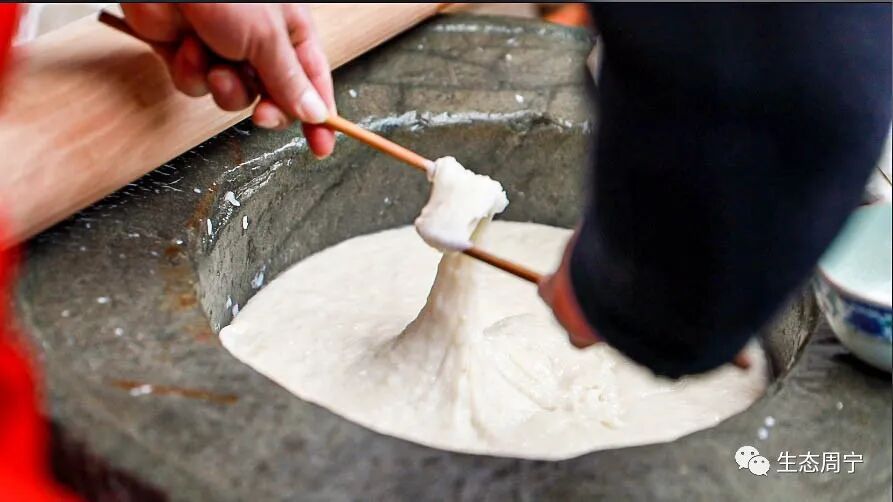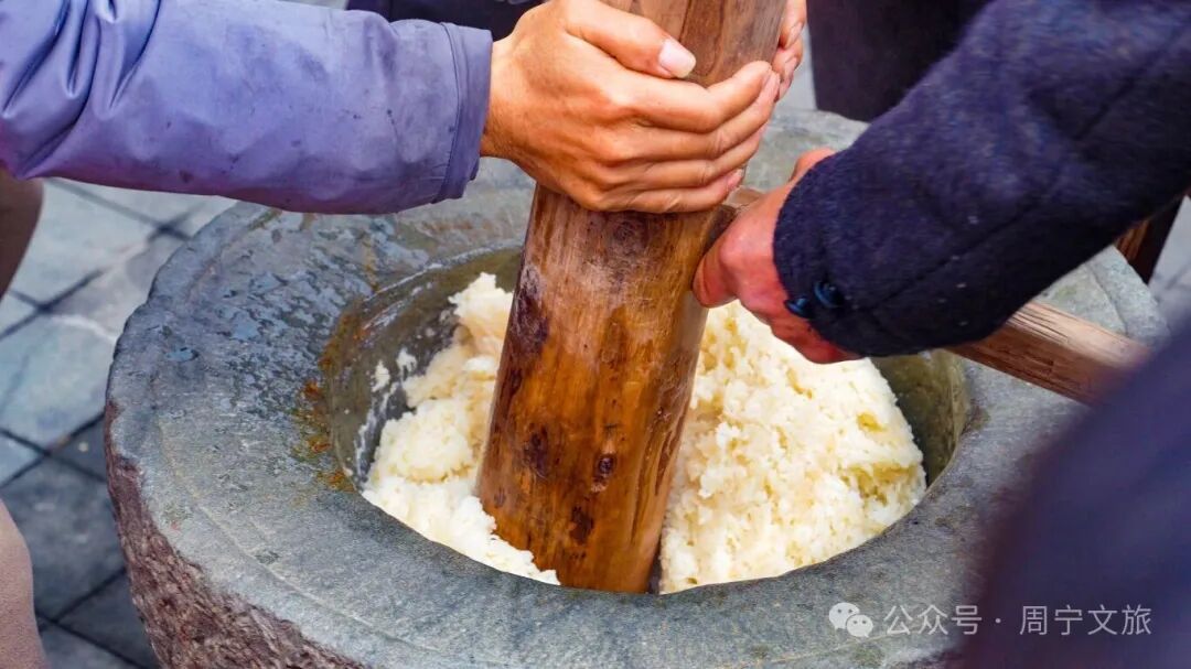 石臼里的糯米 在反复捶捣中愈发软糯黏密 热气腾腾的白雾裹着稻米的清甜 在空气里漾开 惹得围观乡邻笑意盈盈 这是独属于周宁的新年热闹