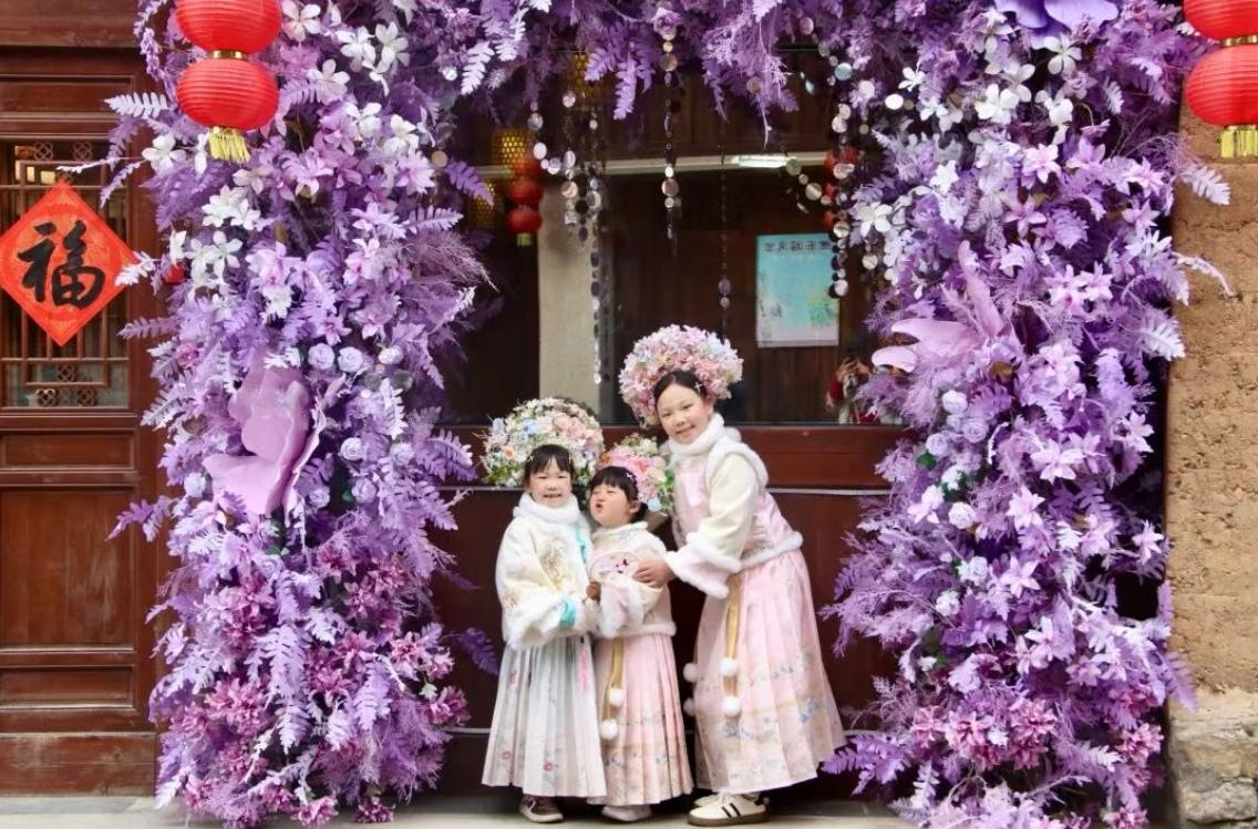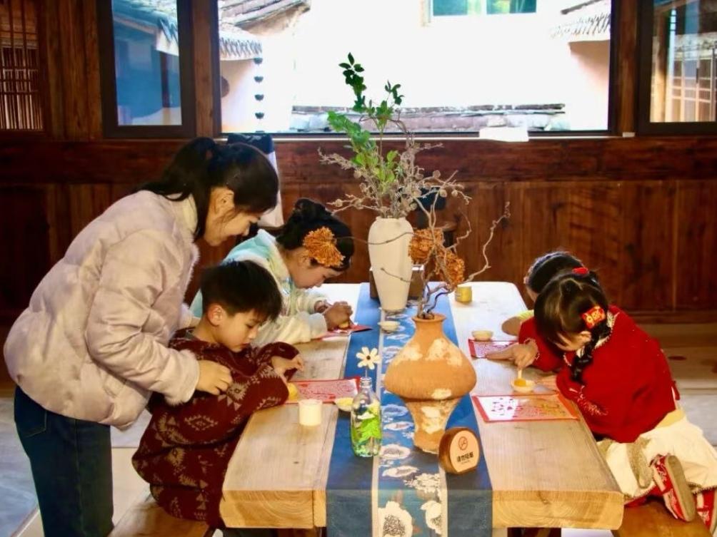 小朋友在“云端壹号”乡村共创平台里体验“福”字拓印 “我们特意在春节前推出写春联、打糍粑、拓福这些传统活动,就是想让游客和居民们能亲手触摸到‘年’的温度。”云端壹号负责人许神球说,“不仅仅是欣赏鲤鱼溪的美丽风景,也希望每个人都能在这里创造属于自己的春节记忆。从目前客房预订和活动咨询的热度来看,今年春节的客流值得期待。” 这两处充满巧思的空间,恰是鲤鱼溪新年气象的生动注脚。漫步于鲤鱼溪景区,清澈见底的溪水中锦鲤悠然,与两岸新挂的串串红灯笼相映成趣,写有“马年添福 喜乐无忧”等字样的红色布条在微风中轻扬,身着汉服的少女与头戴簪花的孩童穿梭其间,取景拍照。