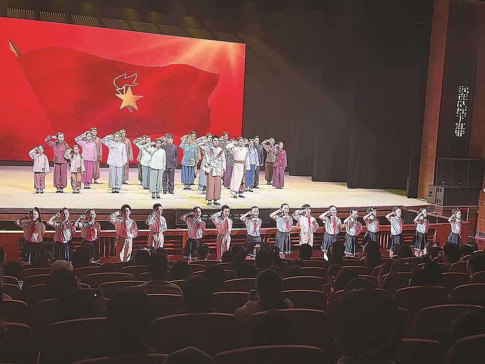 谢幕场面令人感动。 福建日报讯 (记者 陈尹荔 通讯员 李笑扬 陈玫 文/图) 3至4日,闽剧红色题材现代戏《烈士凌福顺》在福建省闽剧艺术中心进行了4场专场演出。 《烈士凌福顺》由省文旅厅出品,省实验闽剧院创排,是福建省舞台艺术精品工程重点剧目、“文艺倡廉”福建省优秀舞台艺术作品。该剧对周宁籍革命烈士凌福顺的生平加以艺术创作,描写了凌福顺从懵懂的热血青年成长为具有坚定理想信念的共产党人的过程。省戏剧会演表演一等奖获得者林宇辉担纲主演。 记者了解到,专场演出创新采用沉浸式舞台呈现模式,打破舞台与观众席的边界,演员时而在主舞台深情演绎,时而移步观众席间,以近距离的表演与观众形成情感共鸣。 来自福州市鼓楼实验小学、福州教育学院附属第一小学等学校的近30名小演员也参与表演。作为省实验闽剧院“闽剧进校园”合作学校的优秀学员,他们稚嫩却坚定的表演,成为舞台上的一抹亮色。 演出伊始,孩子们手捧菊花,开启与革命先烈的跨时空对话。演员用醇厚的闽剧唱腔、细腻的表演,将革命先烈的家国大义与赤胆忠心演绎得入木三分。尾声中,当一声“山河无恙”响彻剧场,全体演员与参演学生缓步走向凌福顺烈士的雕塑,深深鞠躬、敬献鲜花。继而,舞台上下,人们在《百年红船》的旋律中挥舞星灯,聚成光海。 |