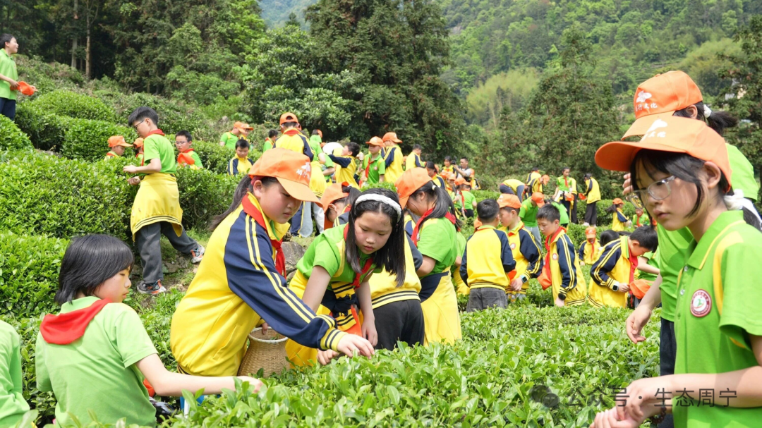 在绿意盎然的茶园中,同学们在工作人员的指导下学习采茶技艺,大家穿梭于错落有致的茶垄之间,体验采茶的辛劳与乐趣。